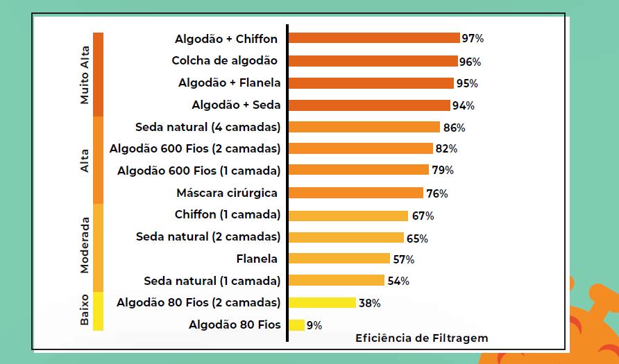 A cartilha "De olho na covid-19", elaborada pela Universidade Federal do Rio de Janeiro (UFRJ), lista os tecidos e suas respectivas capacidades de filtragem de partículas menores que 300 nm, consequentemente, que oferecem maior proteção. Baixe AQUI a cartillha completa.