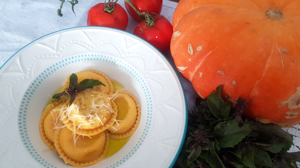 Elegância: A abóbora também dá o tom a massa redonda (sorentino) com recheio de queijo brie, nozes e damascos. A abobora, além de dar a cor, dá mais sabor. O fruto da aboboreira é cozido, passado no liquidificador com ovos, sal e um pouco de azeite. Por fim, mistura com farinha de trigo até dar o ponto certo. Esta massa é levemente adocicada. Apostei em regar com azeite, porque amo. Mas, lembre-se: pode receber molho de tomate, quatro queijos ou branco.