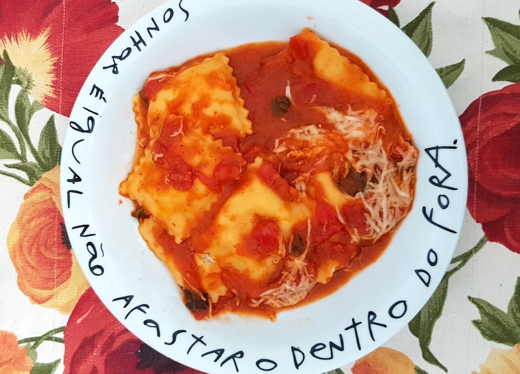 Amei o ravióli de tomate seco, com rúcula e mussarela de búfala ao molho de tomate caseiro, leve e saboroso. O molho é preparado à base de cenoura, cebola, alho, alho poró, salsão, talos do manjericão, folha de louro e tomates. Para finalizar, sal, pimenta do reino, um pouco de açúcar (equilibrar a acidez) e folha de manjericão verde para aromatizar. O responsável por essa belezura é o chef Fellipe Vieira da Silva (@fellippevieira).