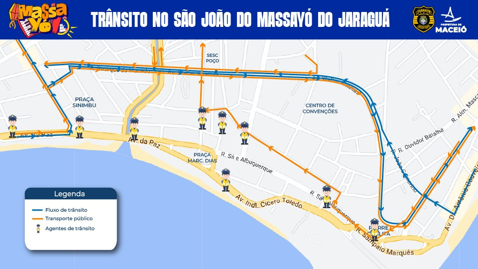 A organização do trânsito contará com 50 profissionais envolvidos garantindo a segurança viária nas áreas interditadas e em pontos específicos, além de agentes de trânsito e fiscais de transportes, também servidores dos demais órgãos da Prefeitura de Maceió garantindo a segurança da população e do público que irá curtir os dias dos eventos, iniciados com o Massayó Gospel, depois nos sete dias do Maior São João do Litoral do Brasil.