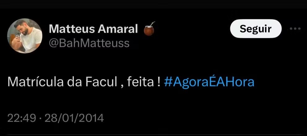 Internautas, revoltados com o episódio, acharam um post do perfil de Matteus no X comemorando a matrícula na faculdade. Confira abaixo: