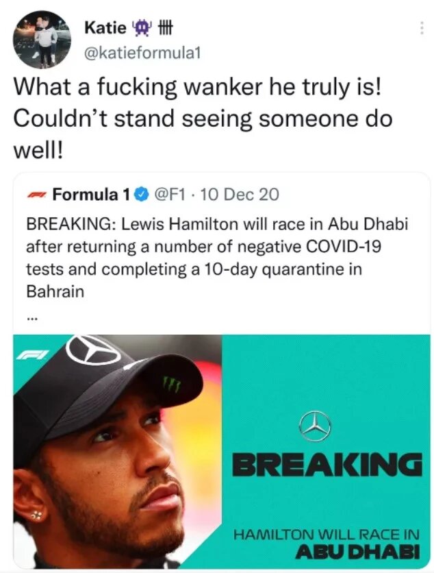 As postagens aconteceram em ocasiões distintas: uma delas aconteceu quando Hamilton voltou ao grid depois de testar positivo para a Covid-19 em 2020. “Que verdadeiro idiota ele é! Não consegue ver ninguém se dar bem”, escreveu a funcionária.