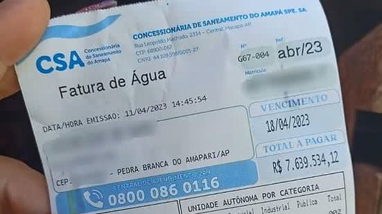Uma moradora de Pedra Branca do Amapari, distante cerca de 183 quilômetros de Macapá, recebeu uma conta de água no valor de R$ 7,6 milhões referente ao mês de abril. A imagem da fatura repercutiu na web nesta quarta-feira (12).