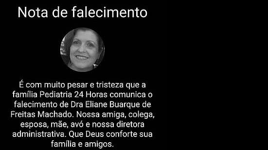 O anúncio da morte foi feito pela direção da clínica: “É com muito pesar e tristeza que a família Pediatria 24 Horas comunica o falecimento de Dra Eliane. Nossa amiga, colega, esposa, mãe, avó e nossa diretora administrativa. Que Deus conforte sua família e amigos", diz a nota publicada nas redes sociais da instituição.