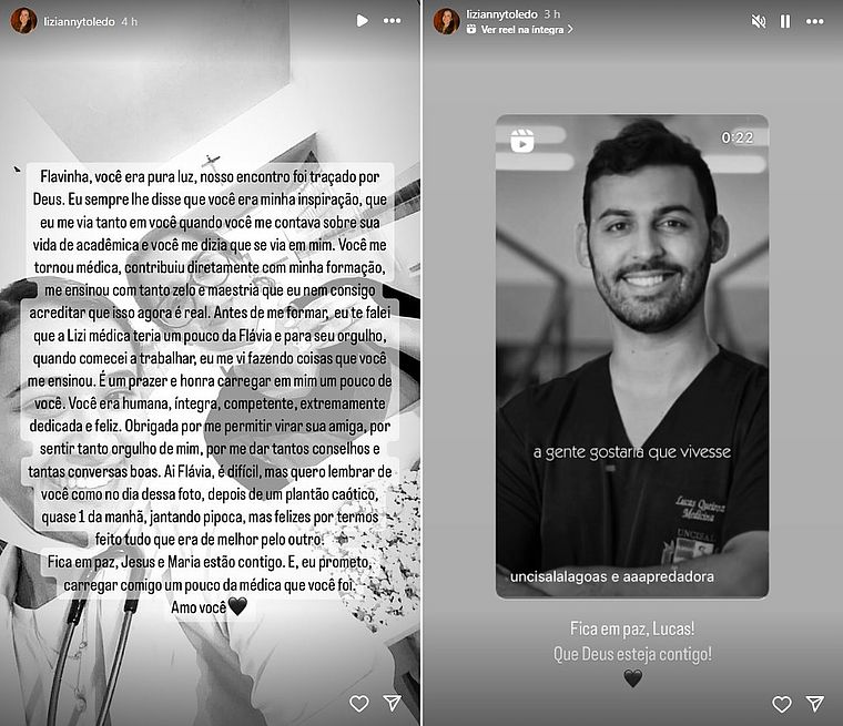 "Flavinha, você era pura luz, nosso encontro foi traçado por Deus. Eu sempre lhe disse que você era minha inspiração, que eu me via tanto em você quando você me contava sobre sua vida acadêmica e você me dizia que se via em mim. Você me tornou médica, contribuiu diretamente com minha formação, me ensinou com tanto zelo e maestria que eu nem consigo acreditar que isso agora é real. Antes de me formar, eu te falei que a Lizi médica teria um pouco da Flávia e para seu orgulho, quando comecei a trabalhar, eu me vi fazendo coisas que você me ensinou. É um prazer e honra carregar em mim um pouco de você. Você era humana, íntegra, competente, extremamente dedicada e feliz. Obrigada por me permitir virar sua amiga, por sentir tanto orgulho de mim, por me dar tantos conselhos e tantas conversas boas. Ai Flávia, é difícil, mas quero lembrar de você como no dia dessa foto, depois de um plantão caótico, quase 1h da manhã, jantando pipoca, mas felizes por termos feito tudo que era de melhor pelo outro. Fica em paz, Jesus e Maria estão contigo. E, eu prometo, carregar comigo um pouco da médica que você foi. Amo você. Fica em paz, Lucas! Que Deus esteja contigo!", publicou Lizianny em dois stories.