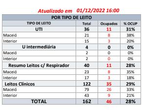 Ainda segundo o boletim diário da Sesau, dos 162 leitos, 36 são de Unidade de Terapia Intensiva. A ocupação das UTIs, segundo o informe epidemiológico, é de 31%, o que corresponde a 11 leitos. Clique aqui e veja o boletim completo.