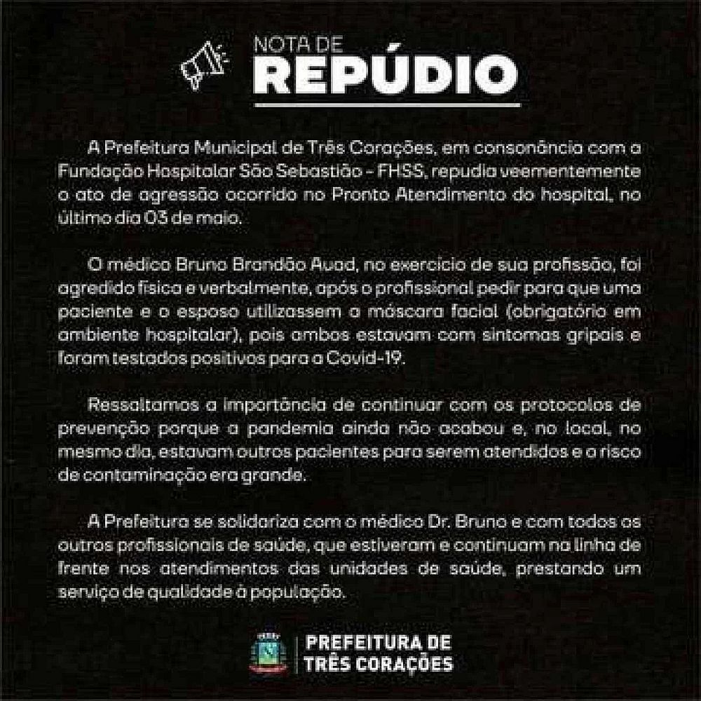 A Prefeitura de Três Corações enviou nota de repúdio ao caso. “A Prefeitura se solidariza com o médico Dr. Bruno e com todos os outros profissionais de saúde, que estiveram e continuam na linha de frente nos atendimentos das unidades de saúde, prestando um serviço de qualidade à população”, ressalta nota enviada à imprensa.