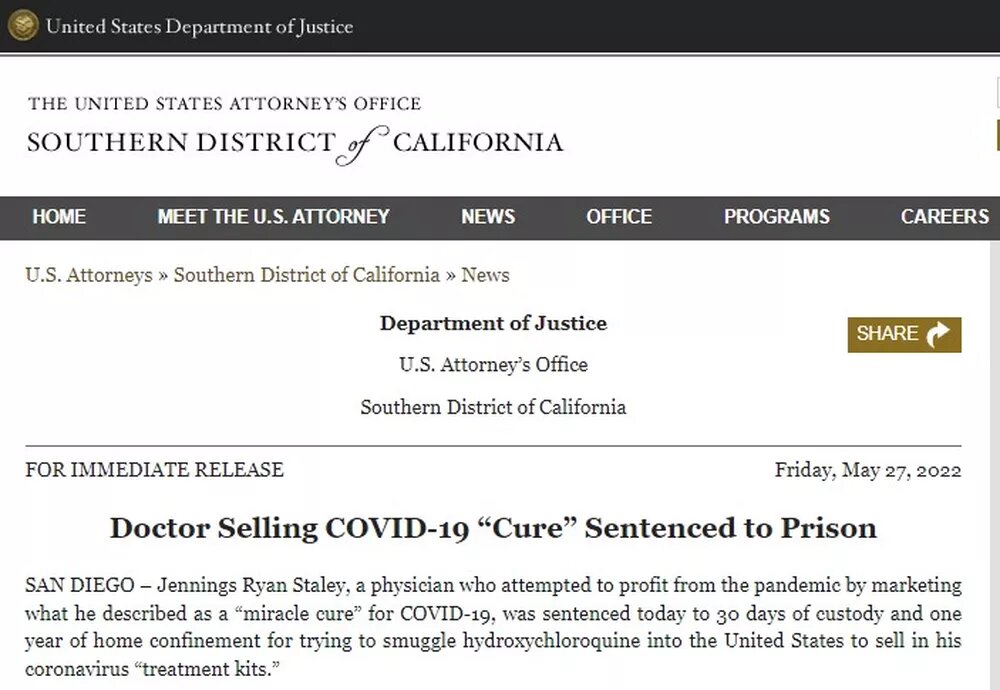 Um agente do FBI se passou por um cliente interessado em conversar com Staley. O médico disse ao agente que o kit com hidroxicloroquina era uma cura de 100%, uma bala mágica, uma arma fantástica e “quase boa demais para ser verdade”.