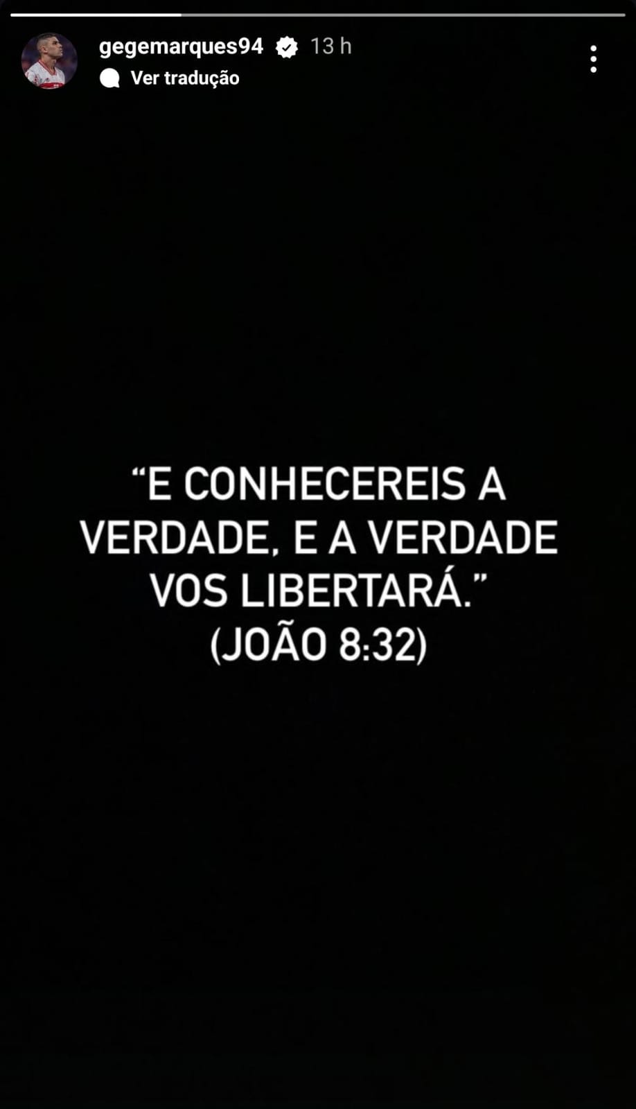 A declaração foi feita durante a tarde de ontem em entrevista à CBN, e horas depois, Gegê publicou versículo da Bíblia sobre "verdade" nas redes sociais, que pode ser uma indireta às falas do gestor. Confira: