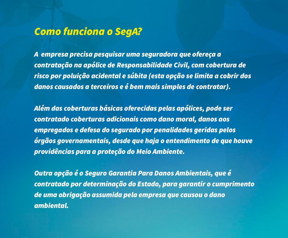Mas para contratar o SegA, a empresa precisar fazer o dever de casa na questão ambiental. Empresas que queiram contratar o SegA precisam comprovar que estão devidamente em dia com suas licenças ambientais, adequadas às exigências legais e também possuir um eficiente sistema de controle. Elas também devem ter uma estrutura capaz de minimizar os efeitos de prováveis danos que possam causar ao meio ambiente no exercício de suas atividades.