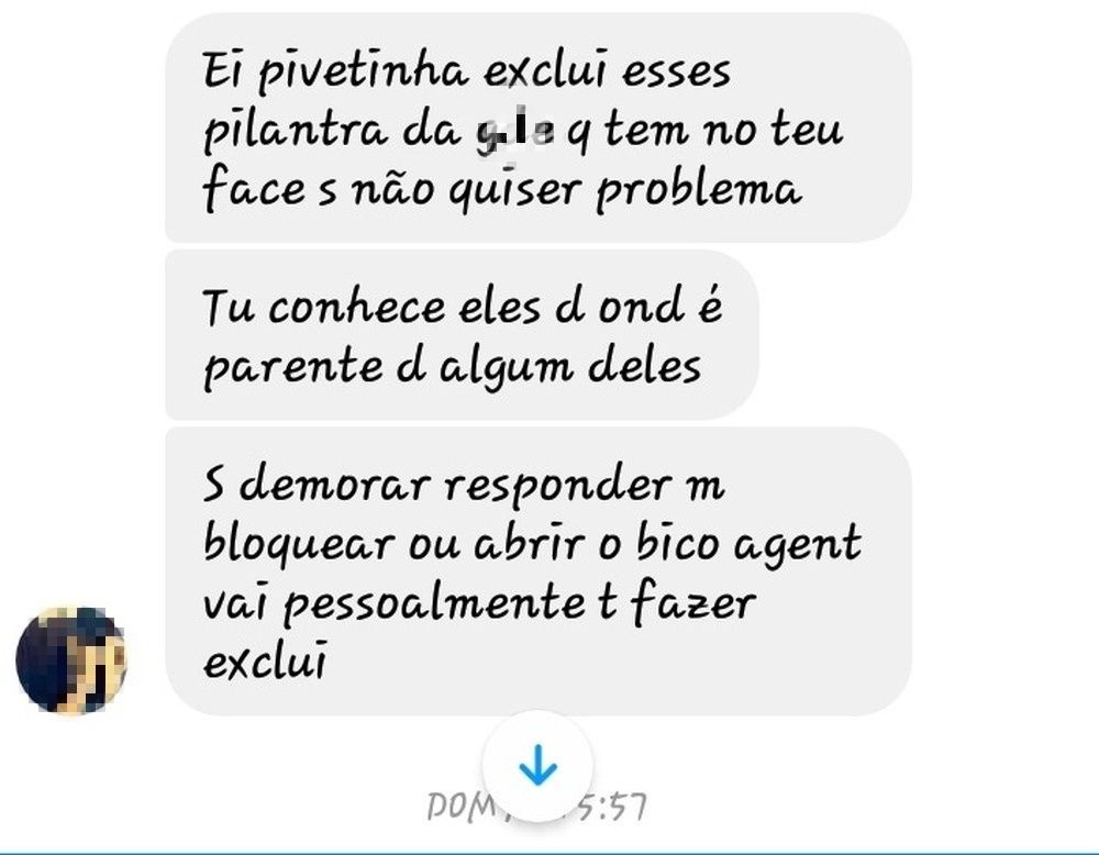 Segundo a família da garota, o argumento de que ela seguiria perfis de pessoas ligadas a facções foi criado como desculpa para as ameaças e para exigir fotos e vídeos íntimos da menor de idade. Com medo, a menina chegou a enviar algumas imagens.Ainda segundo a família, a pessoa enviou à adolescente fotos de parentes dela, o que gerou desconfiança de que o autor das ameaças seria alguém próximo, porque as fotos enviadas estavam postadas nos perfis dos familiares, que não faziam parte da rede de amigos do perfil da garota.