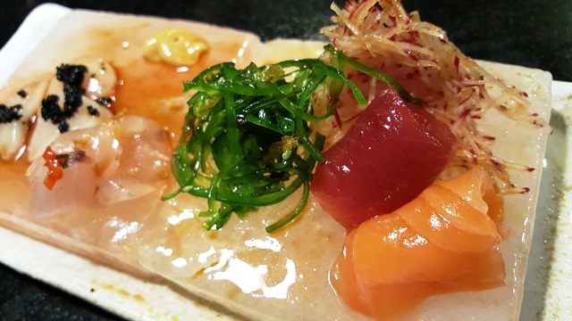 Mar – O nosso peixe serra, comprado em Maceió é uma das estrelinhas do restaurante japonês, textura firme, cor transparente, vem no molho de gengibre, pimenta dedo de moça e o broto de beterraba.