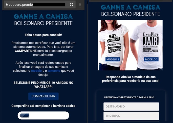 O phishing se vale da inocência dos eleitores oferecendo uma camiseta gratuita com o nome do candidato Jair Bolsonaro; mais abaixo, você entende melhor o que é um golpe de phishing.