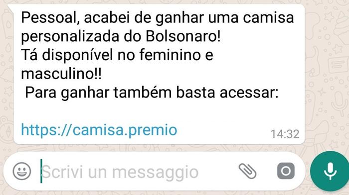 “Pessoal, acabei de ganhar uma camisa personalizada do Bolsonaro! Tá disponível no masculino e feminino! Para ganhar também bastar acessar”, diz a mensagem falsa.