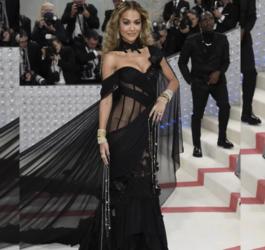 Rita Ora exibiu em um vestido cheio de transparência e uma cauda enorme. Todo all black, o visual fabuloso recebeu ainda mais poder com os acessórios e beleza, que ganhou olho esfumado e unhas poderosas.