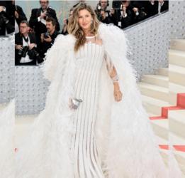 Ela é o poder! Gisele Bündchen surgiu deslumbrante com um vestido todo branco e plumas, muitas plumas. O visual Chanel de 2007 foi usado por ela anteriormente em um editorial da Harpers Bazaar Korea. Na época, o trabalho foi fotografado pelo próprio Karl Lagerfeld.
