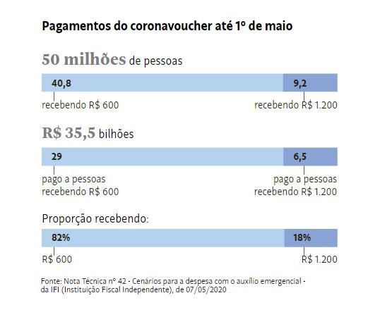 Há três grupos de beneficiários que receberão R$ 600 ou R$ 1.200 do chamado “coronavoucher”. O primeiro é formado por trabalhadores informais que se cadastraram via aplicativo da Caixa. São 20 milhões já recebendo e que devem se tornar 40 milhões no principal cenário da IFI.