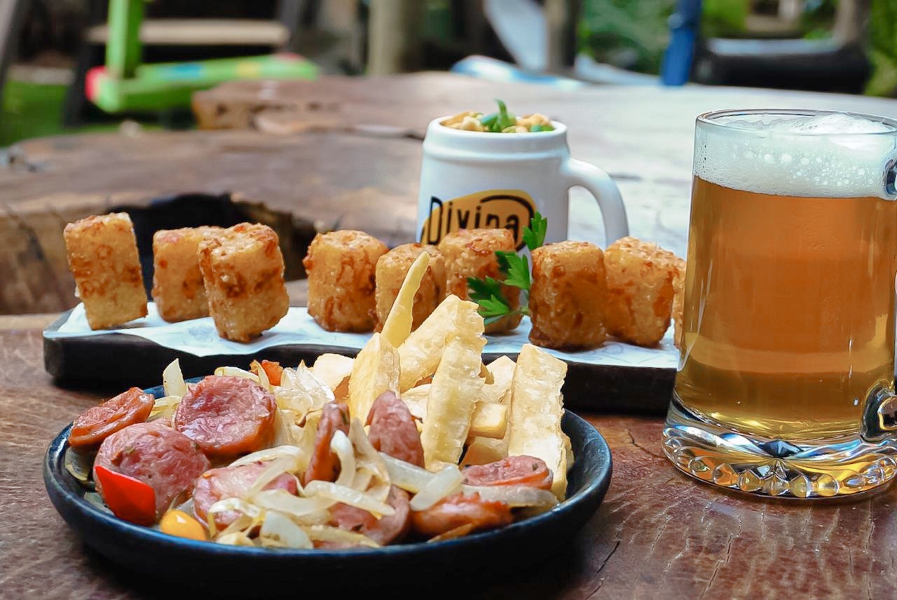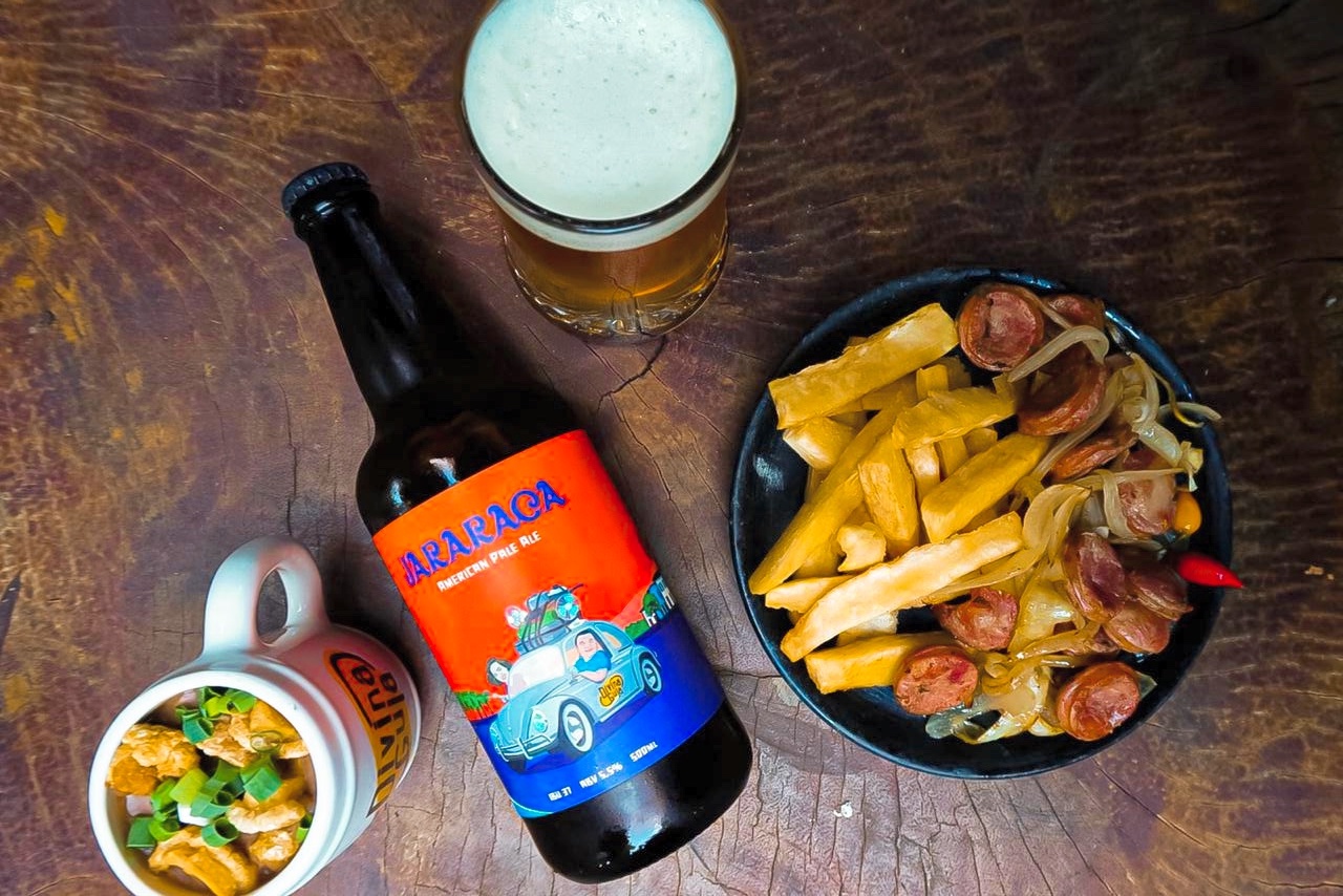 Linguiça caseira com macaxeira frita, tijolinho de tapioca e outras delícias do Divina Gula com chope da Caatinga Rocks