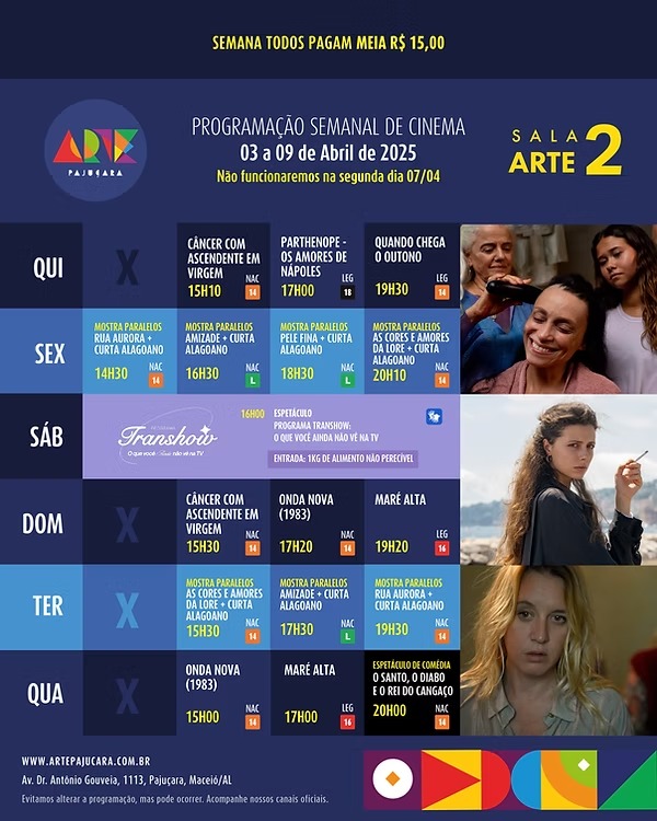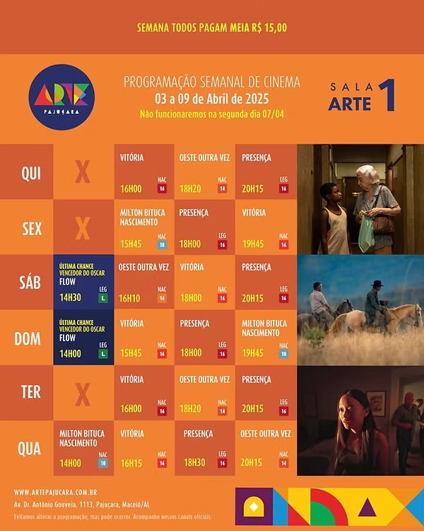 Para conferir a programação completa de todos os filmes em cartaz no Arapiraca Partage Shopping, Centerplex (Shopping Pátio Maceió), Cinesystem (Parque Shopping) e Kinoplex (Maceió Shopping): basta clicar aqui. Já para o Shopping da Vila, em Delmiro Gouveia, pode ser conferida aqui.