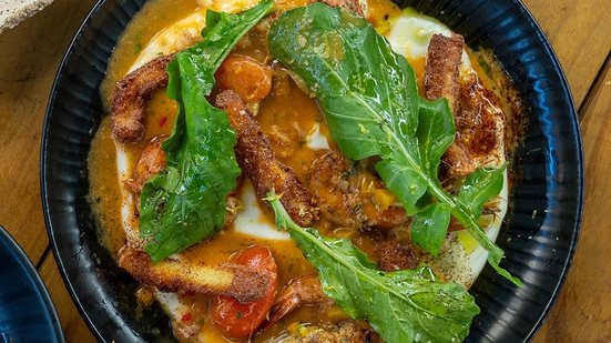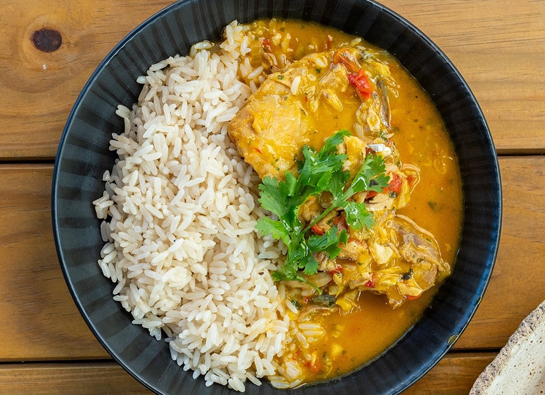 No prato principal, além do mingau pitinga com camarão, também tem moqueca de peixe com arroz branco, coentro e pimenta.