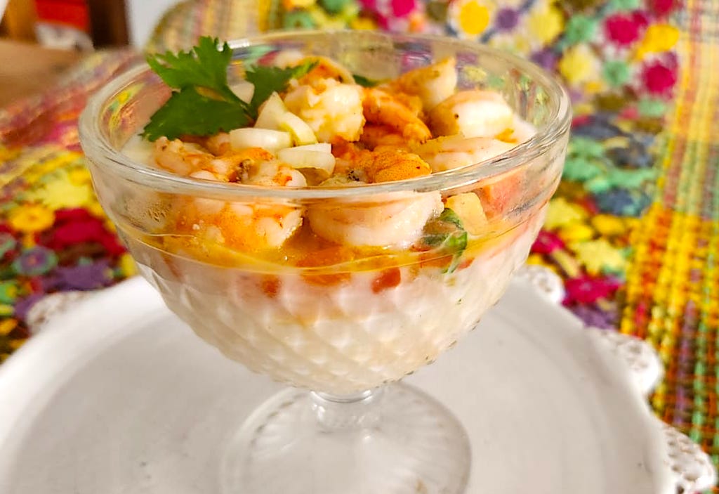 🔪 Distribua o mingau pitinga nas taças e cubra com camarão.