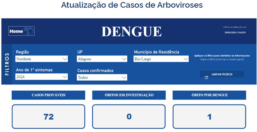 De acordo com os dados divulgados pelo Ministério da Saúde, essa é a primeira morte pela doença confirmada em Rio Largo em 2024. Até o momento, 72 casos prováveis de dengue já foram registrados no município.