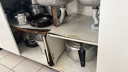 Nos quartos que abrigam crianças e adolescentes do sexo masculino e bebês o caso se repete e traz uma agravante, a cama separada para pessoa com deficiência está quebrada e não há acessibilidade. Com a extensão da inspeção aos outros cômodos, o representante ministerial detectou falta de utensílios, armários da cozinha quebrados, geladeiras sem funcionamento, botijão de gás armazenado irregularmente, o fogão com bocas queimadas, mesa improvisada, a torneira sem água.