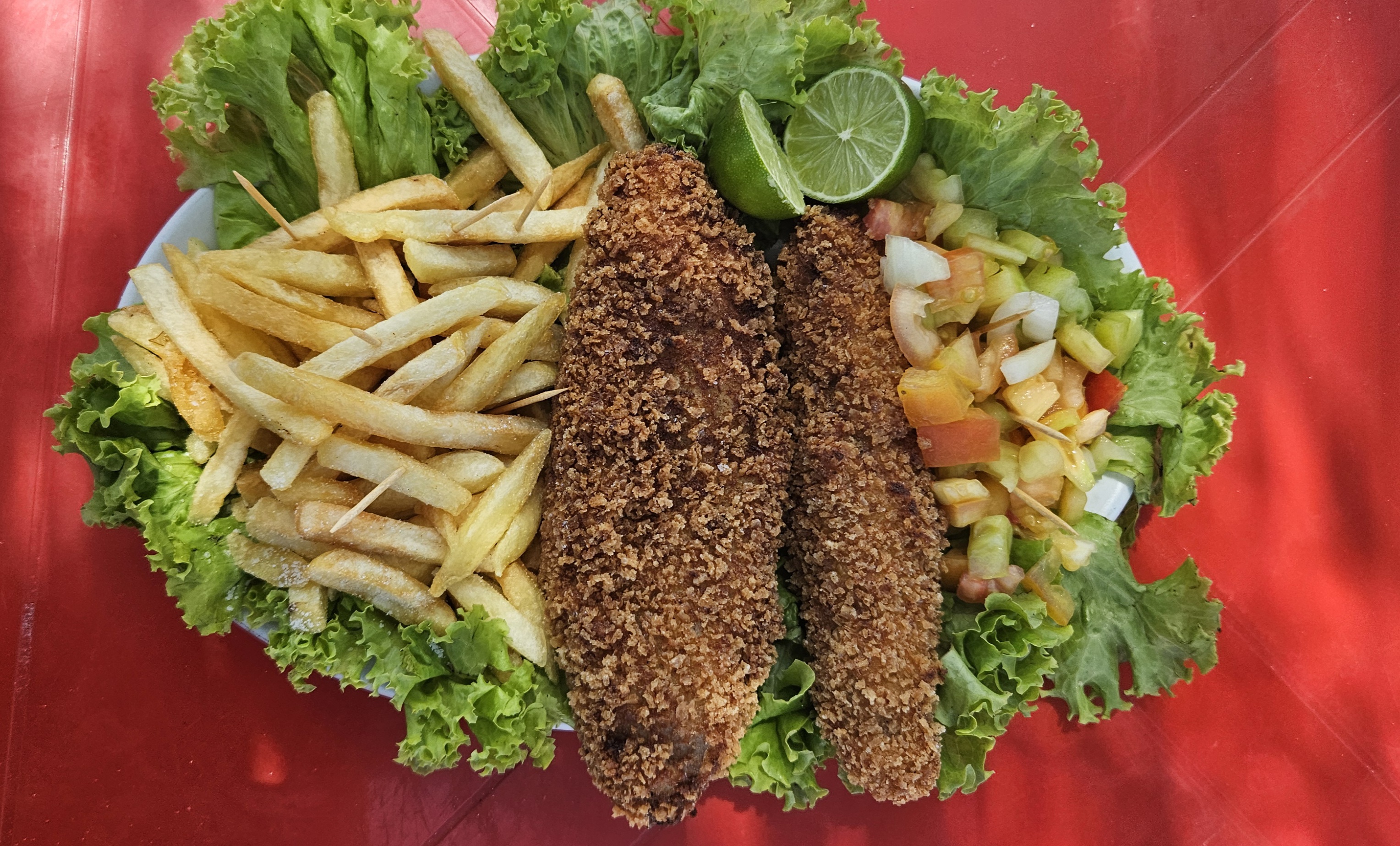 Também é o bom o peixe empanado – duas postas empanadas e suculentas com batata frita. Dispensei o arroz. A porção é para duas pessoas, mas comem três sem reclamar.