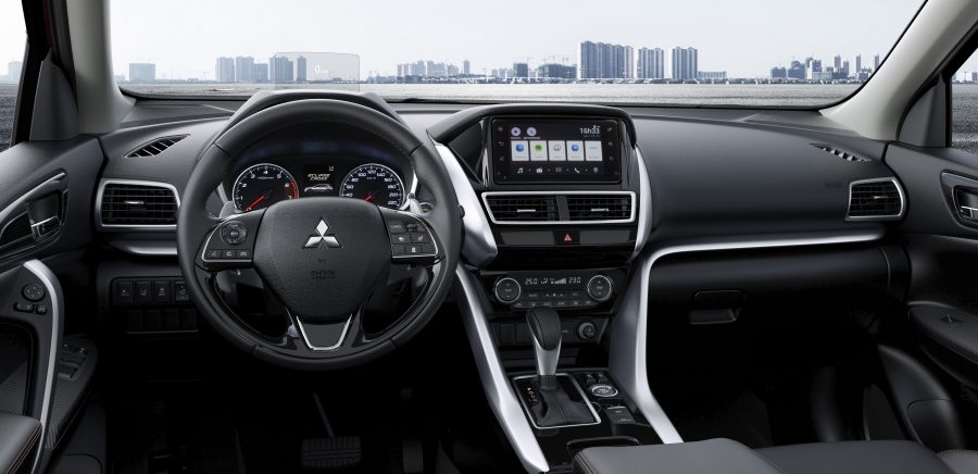 O ar-condicionado é digital, automático e Dual Zone, permitindo a seleção de temperatura para cada lado do veículo. O volante reúne os comandos de voz e áudio, além dos botões do Speed Limiter e do Piloto Automático Inteligente. A direção conta com assistência elétrica e o volante tem ajustes de altura e profundidade. O painel do Eclipse Cross tem tela de LCD de alto contraste com computador de bordo com display de multi-informações.