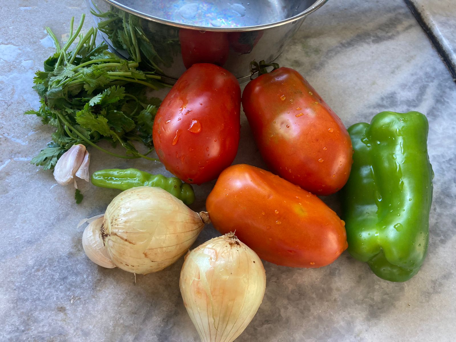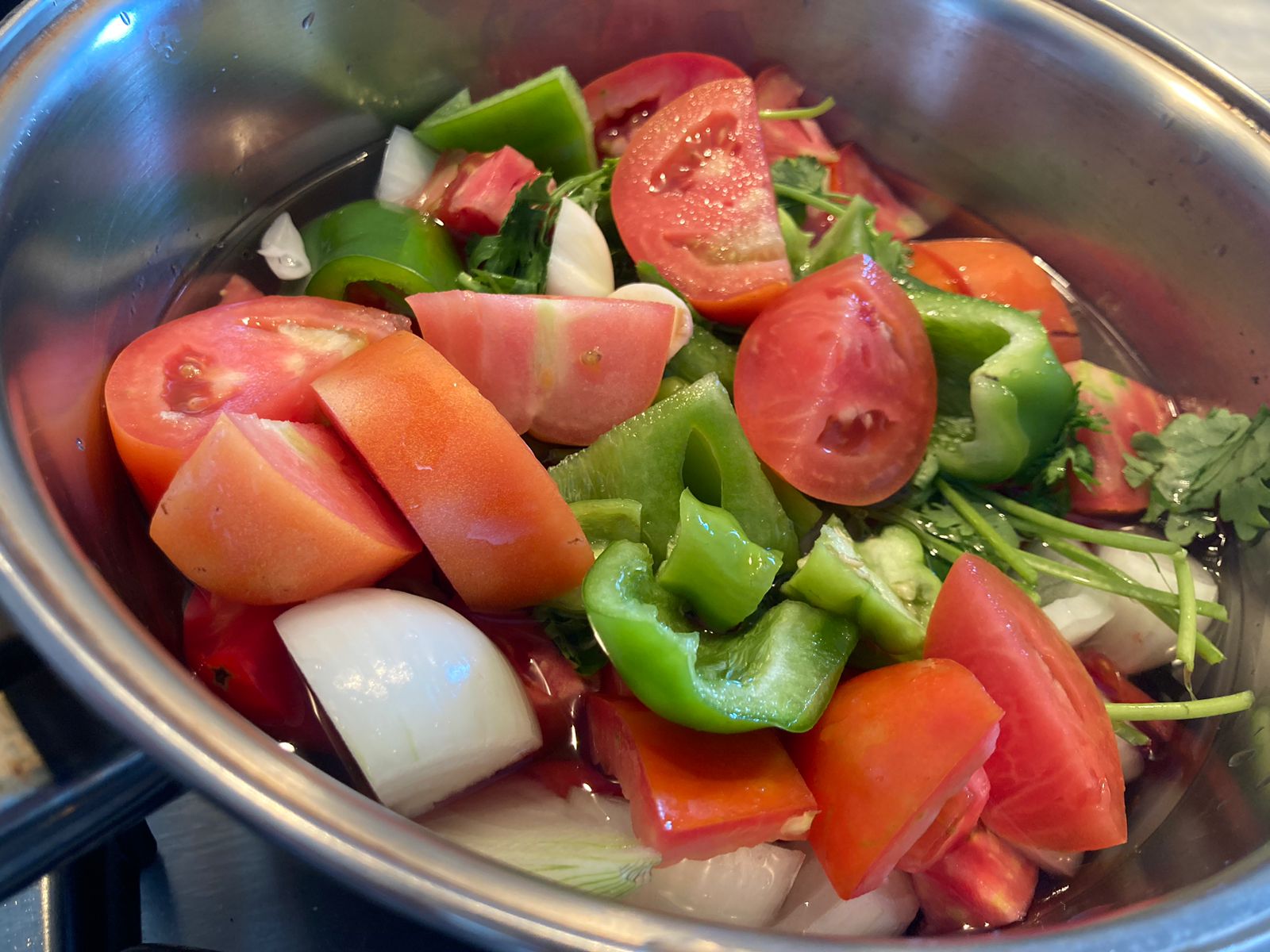 Corte todos os ingredientes em tamanhos grandes, coloque numa panela e cubra com água. Leve ao fogo médio até cozinhar. Em seguida, bata todos os legumes no liquidificador. Na mesma panela, coloque 1 colher de açúcar (para tirar a acidez dos tomates), o orégano, o sal, e um fio de azeite. Refogue. Despeje o molho na panela e deixe cozinhar até ferver.