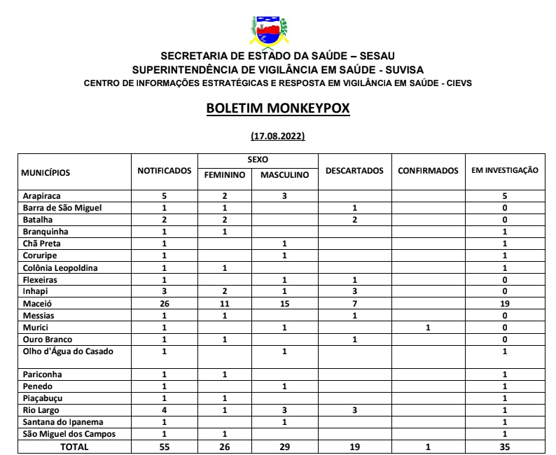 Subiu para 35 número de casos suspeitos de varíola dos macacos que ainda estão sob investigação em Alagoas. O boletim divulgado pela Secretaria de Estado de Saúde (Sesau), no final da tarde desta quarta-feira, 17, mostrou que o estado já teve 54 pessoas com suspeita da doença, mas 19 delas testaram negativo. Alagoas tem um caso confirmado até agora e o paciente reside na cidade de Murici.