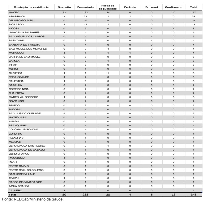Além disso, verifica-se que o município de Maceió é o que possui o maior quantitativo de casos (197; 56,6%) seguido de Arapiraca (28; 8%) e Delmiro Gouveia com (14; 4%) respectivamente. Foram excluídos 04 casos por não atenderem definição proposta pelo Ministério da Saúde dos seguintes municípios: Arapiraca, Pindoba, Maragogi e Viçosa. Veja o boletim completo.