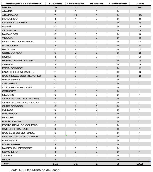 Até esta segunda-feira, foram notificados 202 casos suspeitos da doença. sendo 1 caso provável, 76 descartados. Além disso, verifica-se que o município de Maceió é o que possui o maior quantitativo de casos, 106 até agora, seguido de Arapiraca, que já notificou 18 casos. No que se refere aos casos positivos, todos são do sexo masculino, tendo como municípios de residência Maceió e Murici, com idade de 37, 35 e 25 anos, respectivamente. Veja o boletim completo.