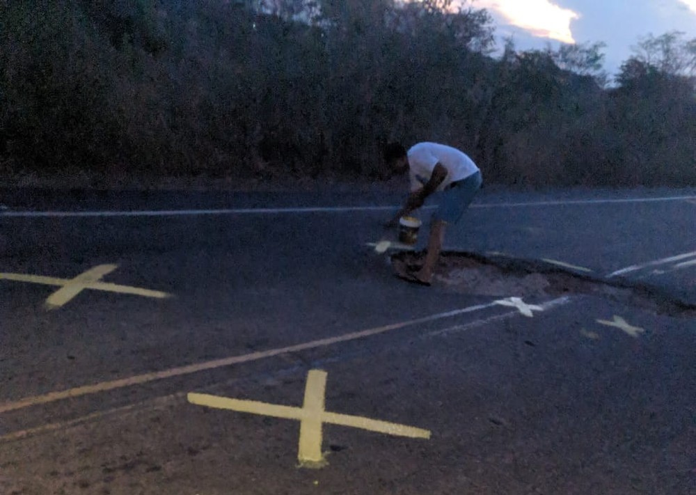Um morador de Canto do Buriti, no Piauí, teve uma iniciativa para ajudar os motoristas que passam pela rodovia PI-141 e evitar mais acidentes na região. Wilson Ferreira pintou avisos no asfalto sobre a presença de buracos na pista.