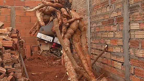 A mandioca foi colhida na última quinta-feira (18) no Setor Central da cidade. O aposentado ficou impressionado com o tamanho e disse que todas as mandiocas deram em uma só raiz.
