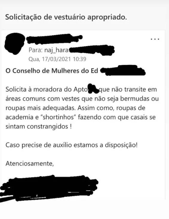 A técnica de laboratório Najhara Noronha, de 36 anos, estava em casa, em Brasília, na quarta-feira (17), fazendo uma prova online da faculdade, quando foi surpreendida com um e-mail. Segundo ela, vizinhas pediram que a moradora do Sudoeste não transitasse nas áreas comuns do prédio com roupas de academia e "shortinhos". As informações são do G1.