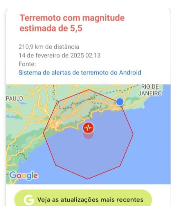 A Defesa Civil de São Paulo informou que não emitiu nenhum alerta para terremoto e que não há registro de ocorrência relacionada ao possível abalo no estado. Na madrugada desta sexta-feira (14), moradores de São Paulo e do Rio de Janeiro receberam um aviso de terremoto em Ubatuba e cidades do litoral norte paulista, a cerca de 200 quilômetros da capital.
