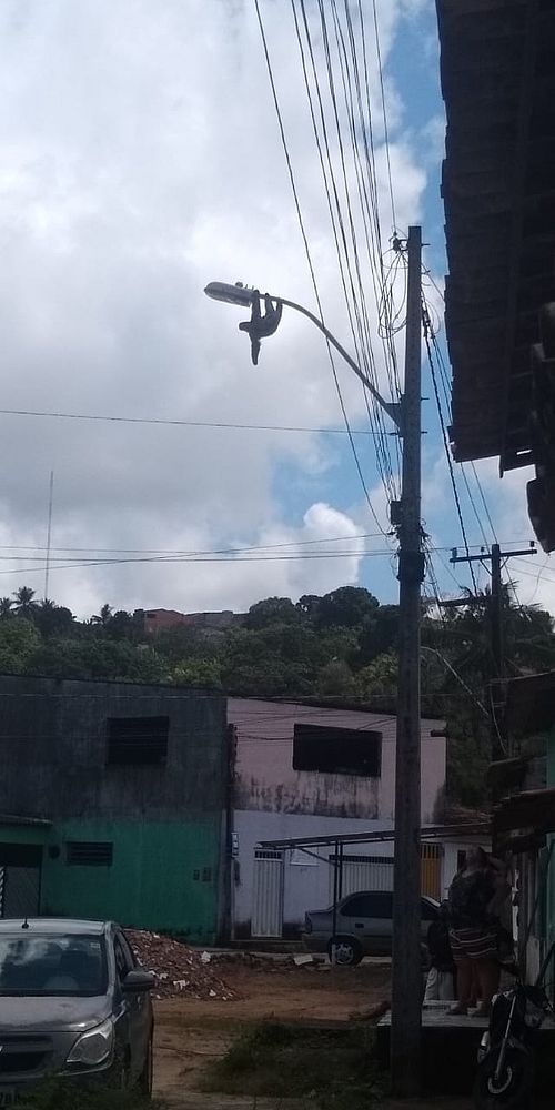 Um bicho-preguiça preso no alto de um poste de energia elétrica, na tarde desta segunda-feira (17), foi resgatado por moradores da Rua Marquês de Abrantes, no bairro do Bebedouro, em Maceió.
