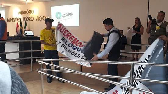 Um protesto pacífico de moradores no início da audiência pública para a apresentação do relatório técnico do Serviço Geológico do Brasil (CPRM) sobre a instabilidade do bairro Pinheiro e áreas adjacentes, na sede da Justiça Federal, foi barrado logo no início da audência.