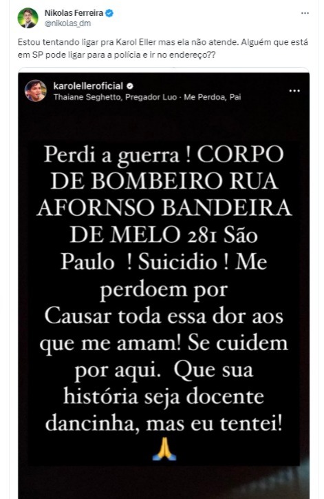 - Na noite de ontem, Nikolas publicou nas redes sociais que tentava ligar para Karol, mas ela não atendia. Ela publicou nas redes sociais que havia "perdido a guerra" e falava em suicídio. O post foi apagado.