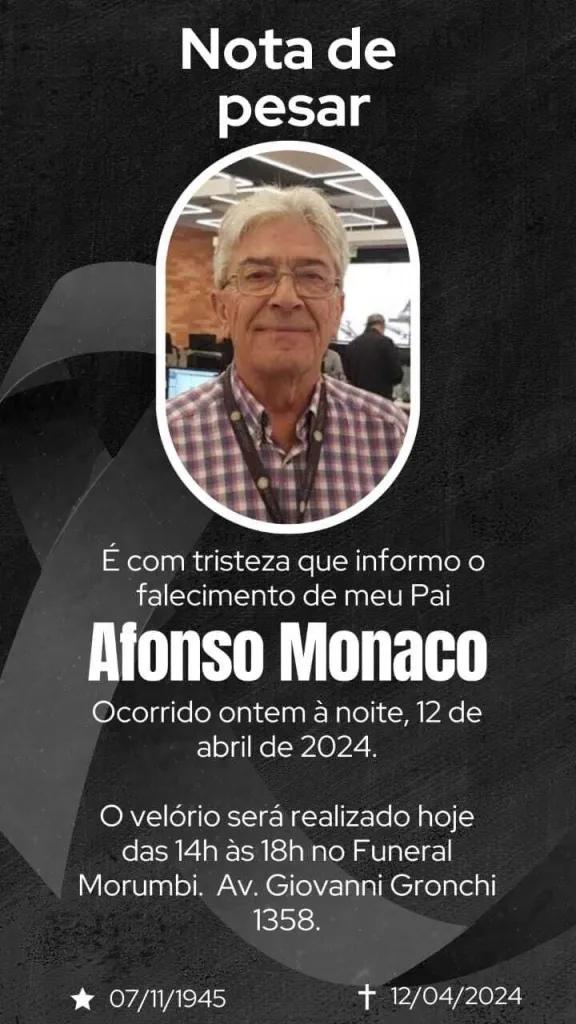 "É com profundo pesar que a RECORD comunica e lamenta o falecimento do jornalista AFONSO MONACO, aos 78 anos, na noite desta sexta-feira, 12 de abril, vítima de um câncer. Sua partida deixa uma lacuna significativa no cenário jornalístico brasileiro.