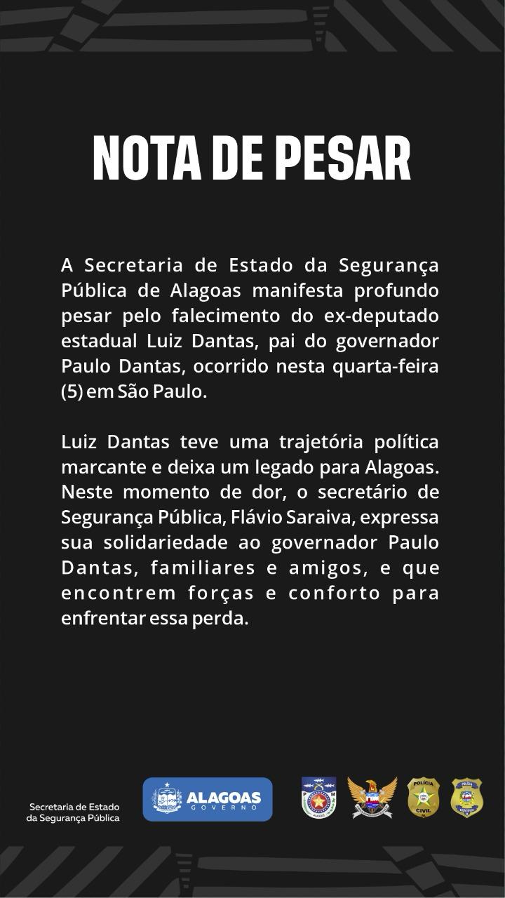 Da mesma forma, a Secretaria de Estado da Segurança Pública, por meio do secretário Flávio Saraiva, ressaltou a trajetória marcante do ex-deputado Luiz Dantas em nota oficial.