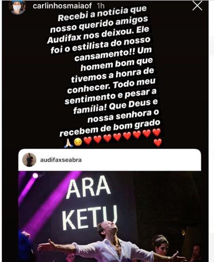 Já o influenciador conhecido como o 'Rei do Instagram', Carlinhos Maia, disse que foi uma honra conhecer Audifax e manifestou solidariedade aos familiares do estilista.
