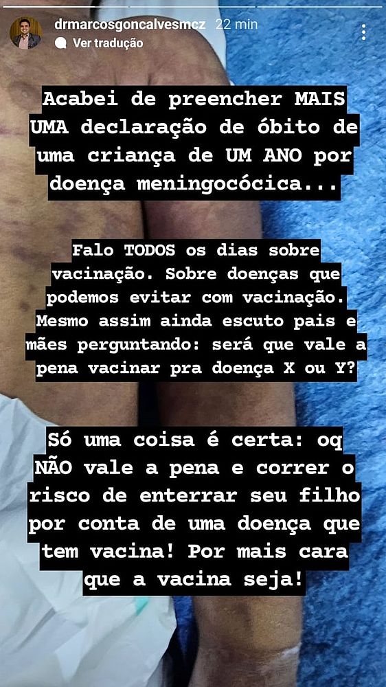 De acordo com Gonçalves, a morte da criança foi confirmada cerca de 24 horas após a suspeita da doença. "Acabei de preencher mais uma declaração de óbito de uma criança de um ano por doença meningocócica. Falo todos os dias sobre vacinação. Sobre doenças que podemos evitar com vacinação. Mesmo assim ainda escuto pais e mães perguntando: será que vale a pena vacinar pra doença X ou Y? Só uma coisa é certa: o que não vale a pena e correr o risco de enterrar seu filho por conta de uma doença que tem vacina! Por mais cara que a vacina seja!".