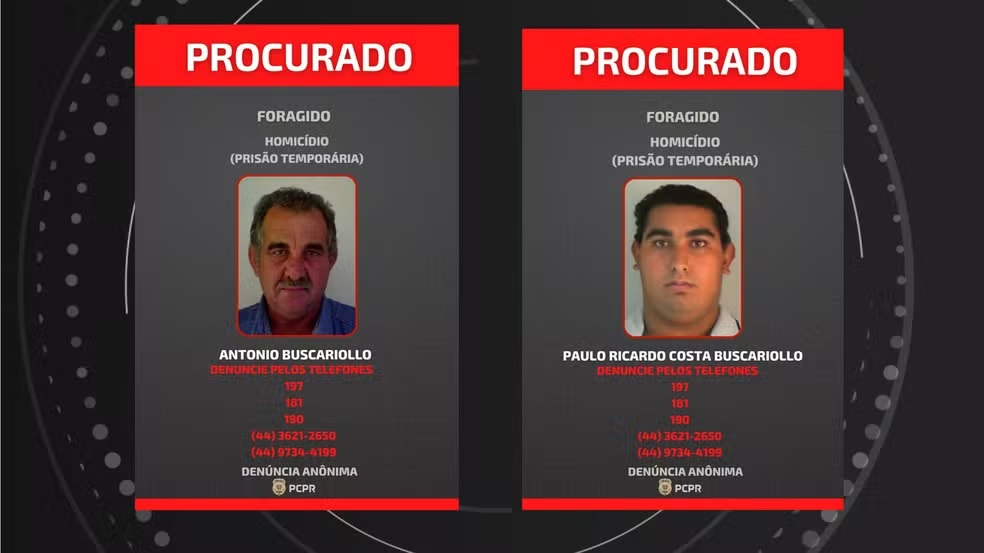 Os principais suspeitos do crime são Antonio Buscariollo, de 66 anos, e o filho, Paulo Ricardo Costa Buscariollo, de 22. A Polícia Civil (PC-PR) considera os dois como foragidos desde o dia 9 de agosto.