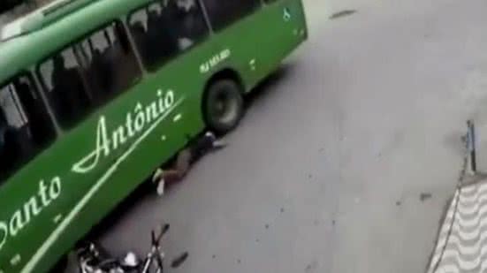 O motociclista Alex Silva Peres, 19, sobreviveu com ferimentos leves a um acidente em Belford Roxo, na Baixada Fluminense (RJ), mesmo após ir parar embaixo de um ônibus, com a cabeça na direção de um dos pneus do veículo, em uma esquina da avenida dos Colonizadores, na manhã de segunda-feira (18).