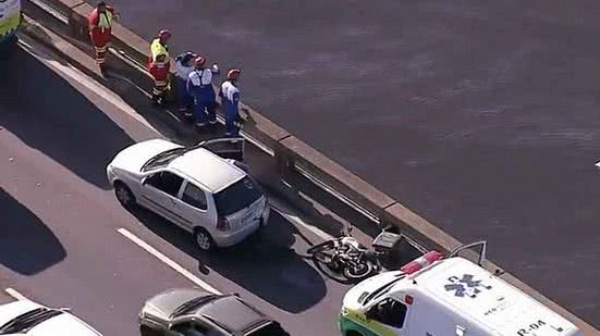 Um motociclista morreu após colidir com um carro e cair da ponte Rio-Niterói na manhã desta terça-feira (23). O acidente ocorreu por volta das 7h, na subida do Vão Central, no sentido Niterói. O homem de 46 anos foi resgatado da Baía de Guanabara em uma operação que teve auxílio de um helicóptero do Corpo de Bombeiros.