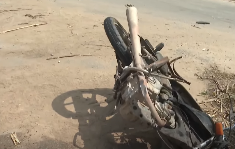 A moto ficou completamente destruída, e partes de botijões que eram transportados se espalharam pela pista.