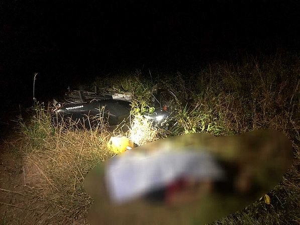 Em imagens fornecidas pelo BPRv, é possível ver que tinha um capacete ao lado da motocicleta e o local do tombamento seria uma mata ao redor da pista. Confira: