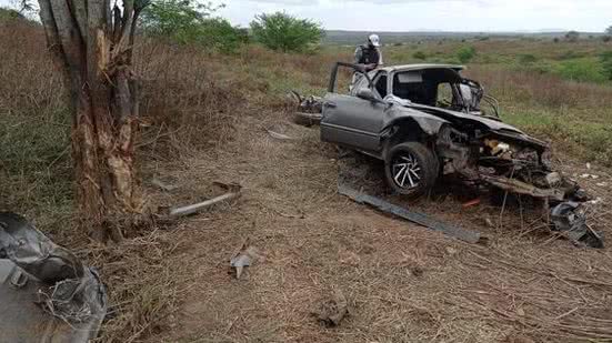 Com a batida forte, o Honda Civic ficou com a parte frontal e lateral totalmente destruída. Peças do automóvel foram arremessadas para fora com o impacto.
